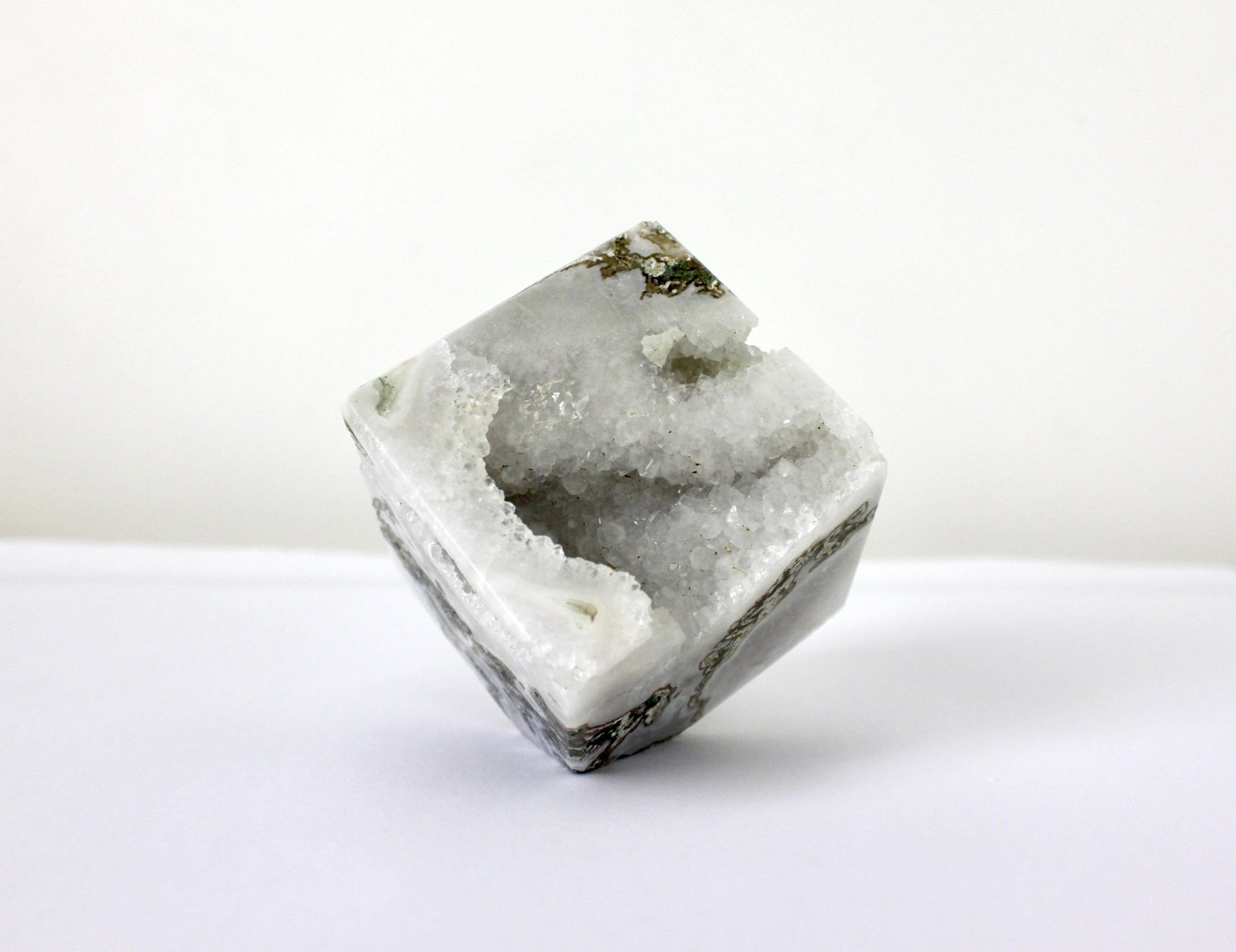 Beautiful moss agate cube with clear quartz geode. Slanted so it sits on one corner.